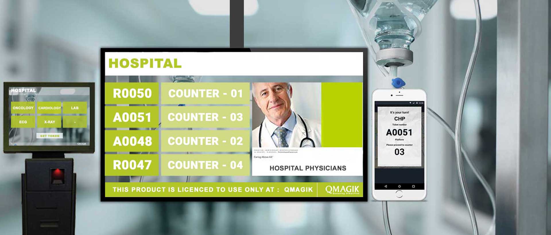 Digital signage systems are placed in the waiting area, where all the promotional videos are played along with the information about the current serving tokens.